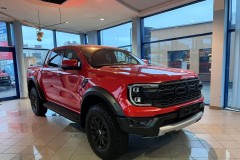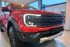 Samochód prezentuje się znakomicie w efektownym czerwonym kolorze, który idealnie podkreśla sportową, muskularną sylwetkę i wyjątkowy charakter modelu Raptor.